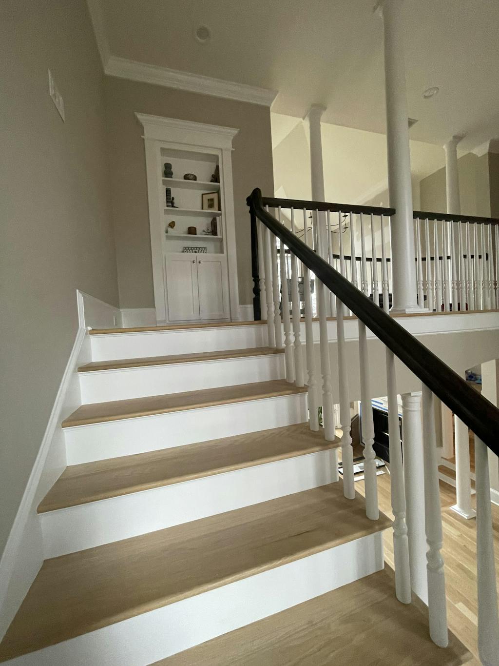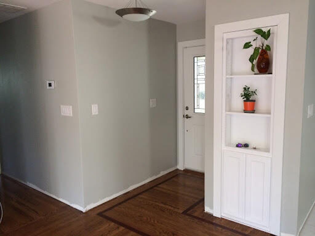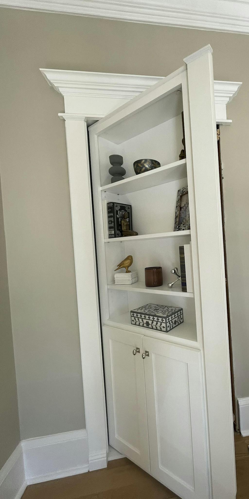 There was a plain door that entered an unfinished storage room at the top of our entry staircase that we wanted to disguise. The Murphy door was a great solution to hide the rarely used space and upgraded the feel of our foyer. Since it is an out swing door, we added some extra trim pieces to further disguise the seams. We don’t go into the room often, so we also placed a couple trim pieces at the base that just rest on the floor and we pick them up to allow the door to swing out whenever we want to open it.