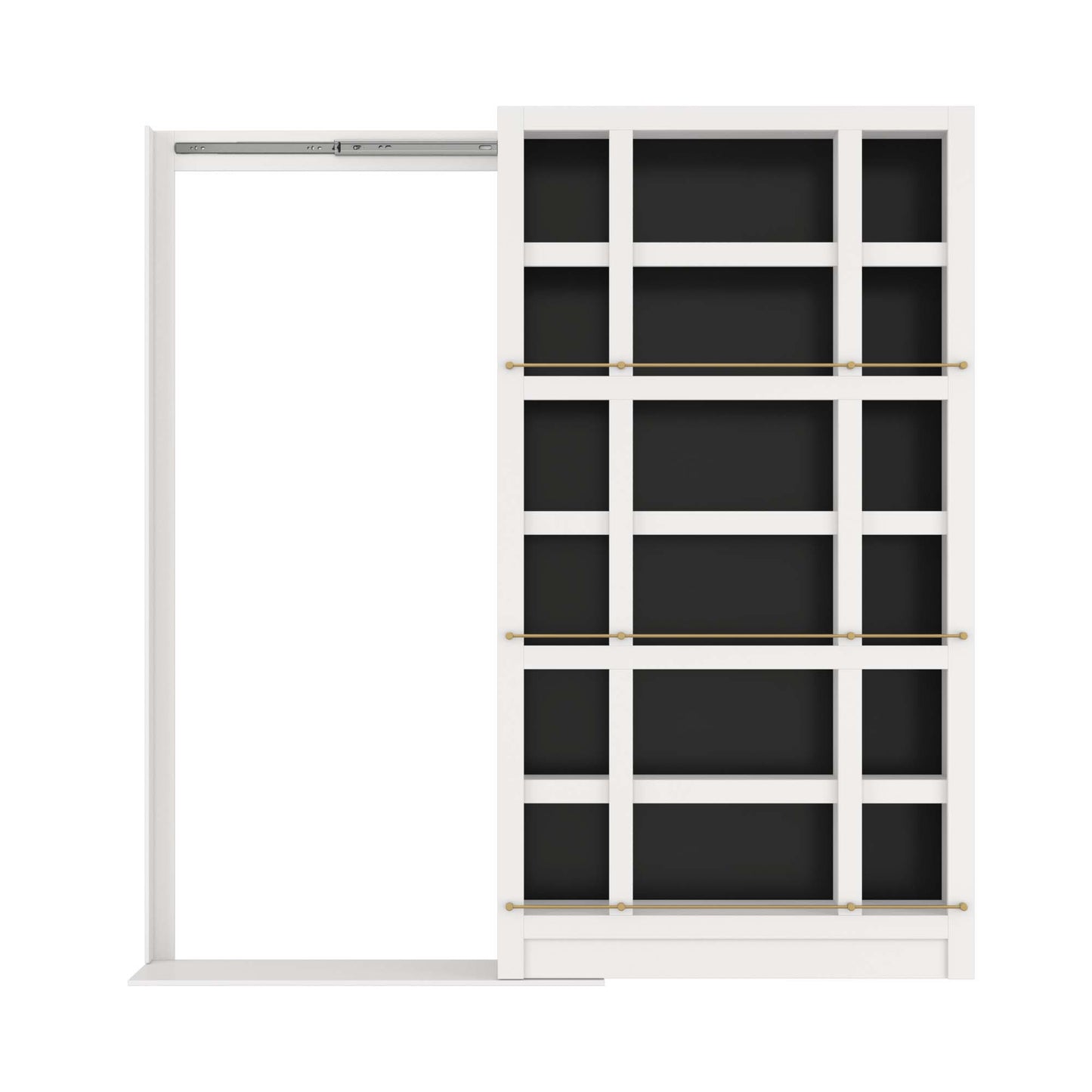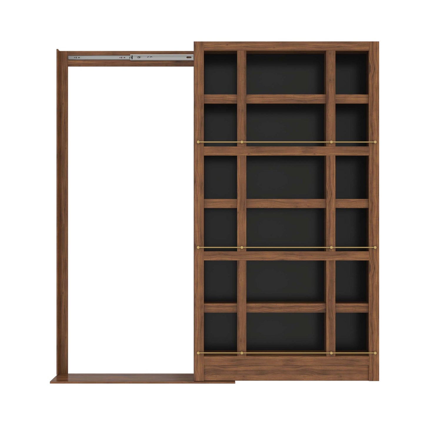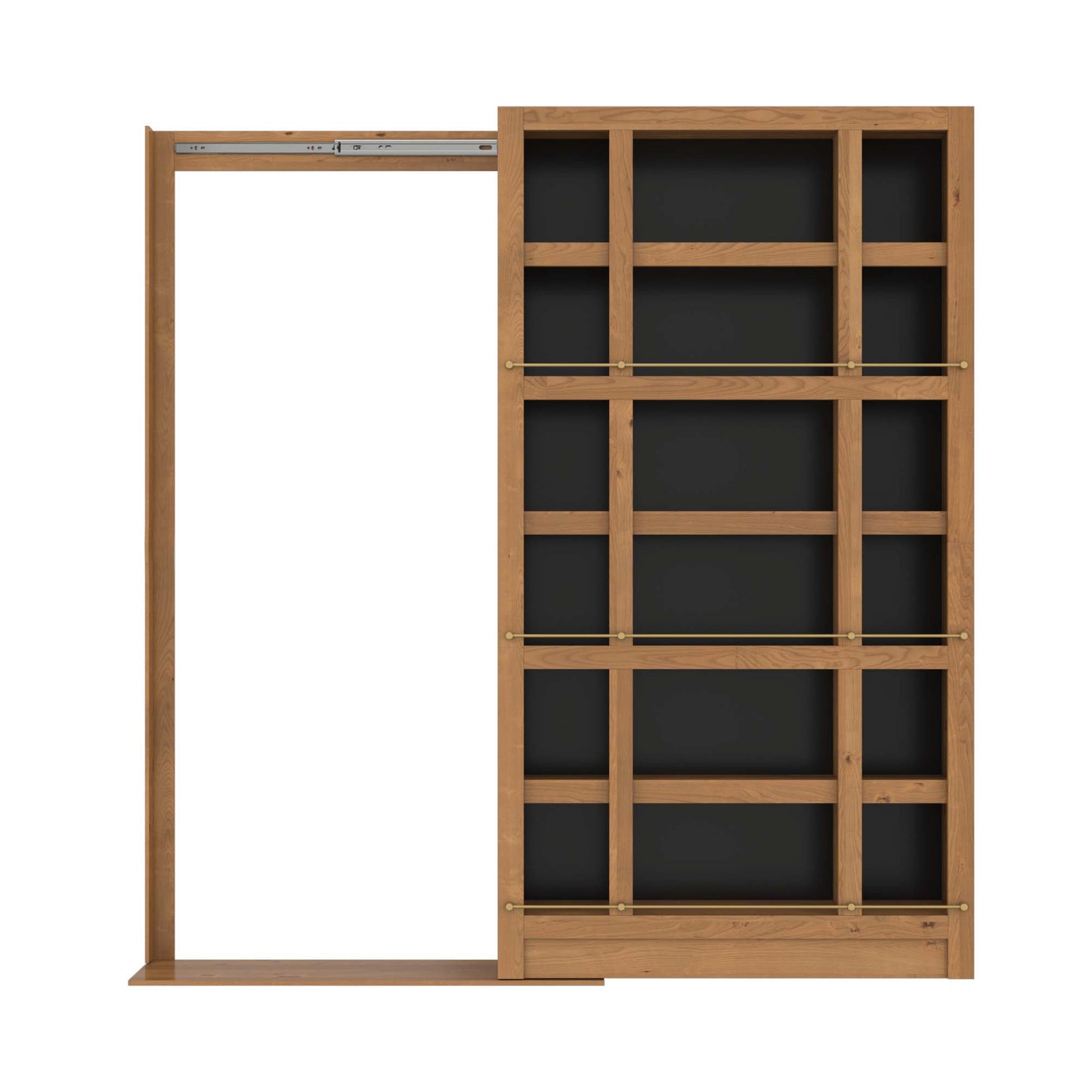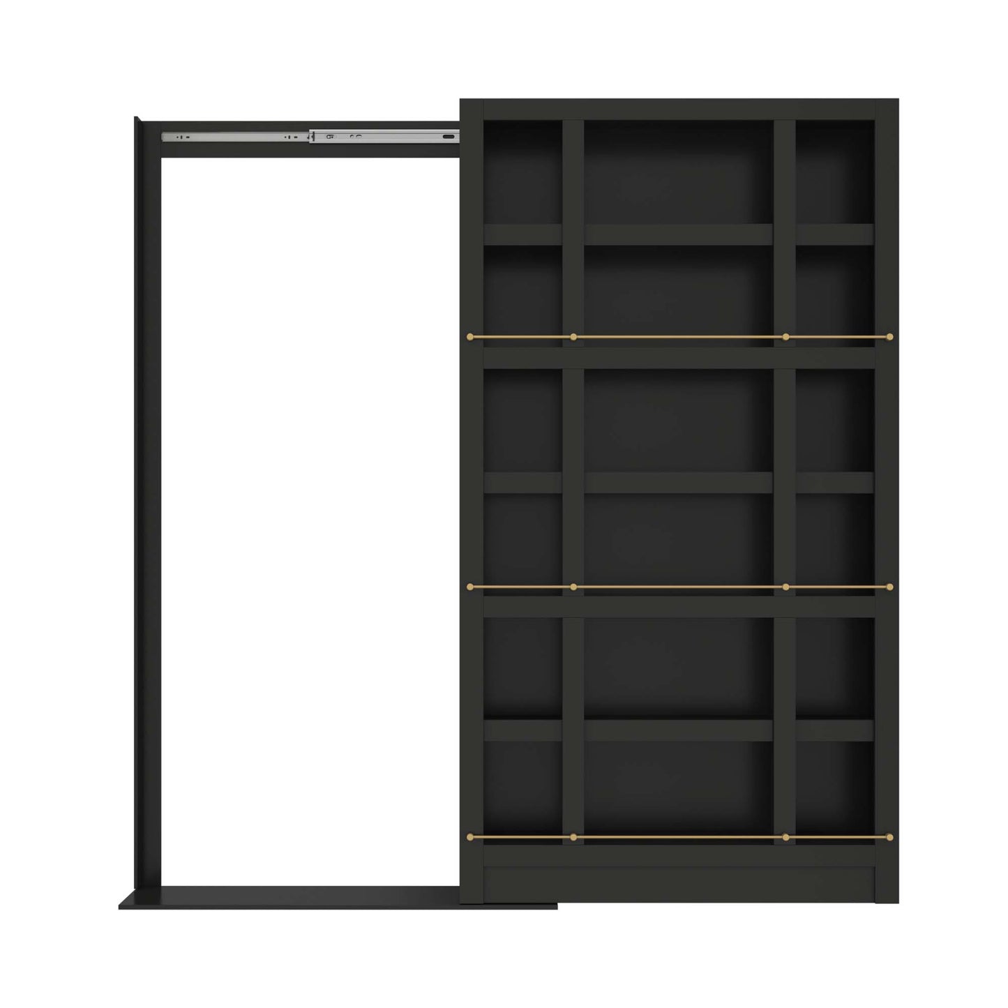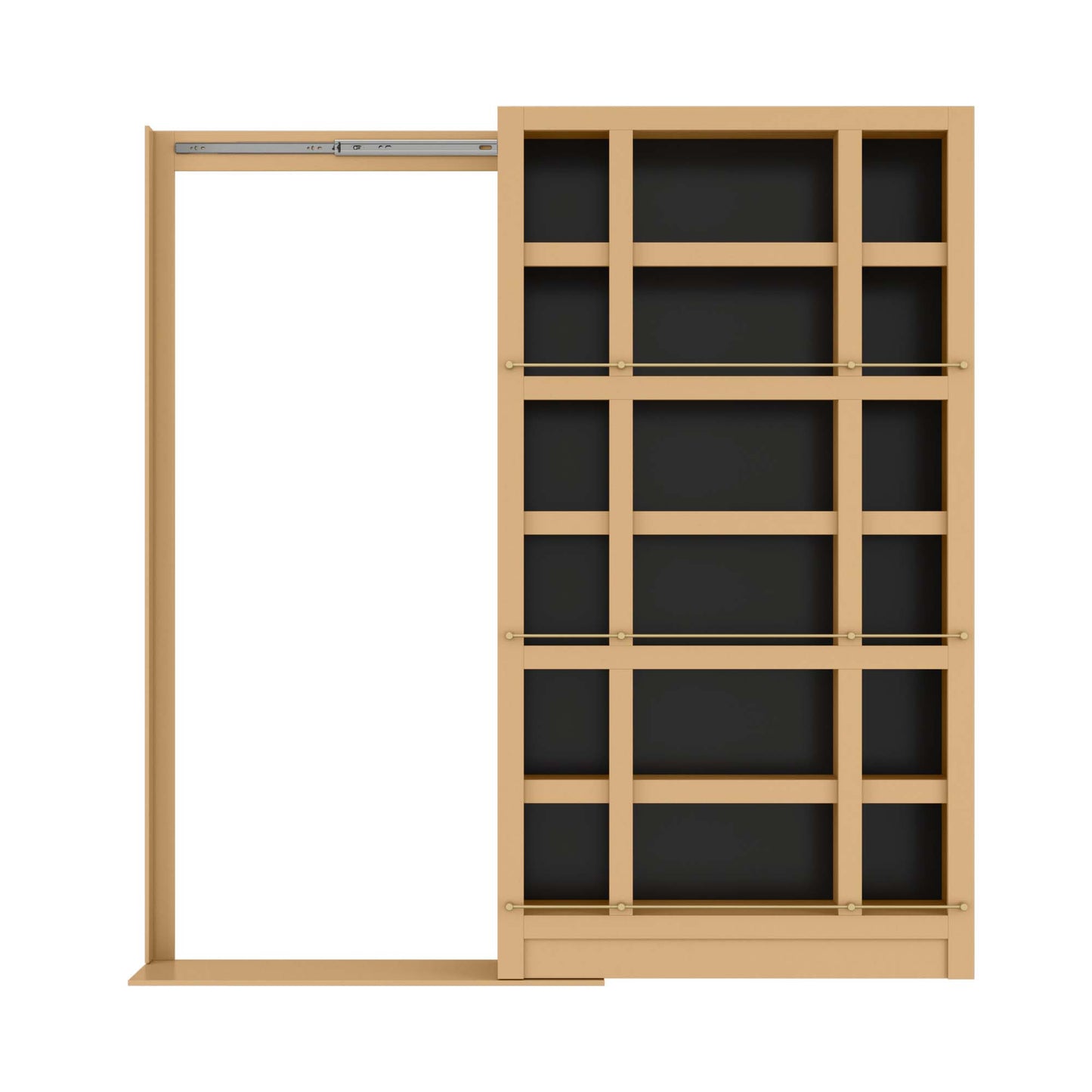 Blending innovation with elegance, this sliding Murphy door features configurable shelving to adapt to your storage needs. Gold accents provide a touch of luxury, ensuring this piece isn’t just practical—it’s a statement. Expertly crafted from high-quality materials, it’s built for durability and long-lasting performance. Unlike any other sliding hidden door, our exclusive caster system glides smoothly without ever touching your existing floor, preserving its integrity while delivering a sleek, space-saving solution.