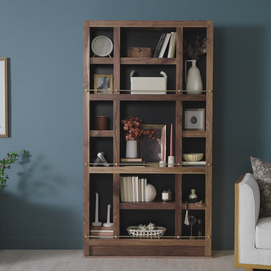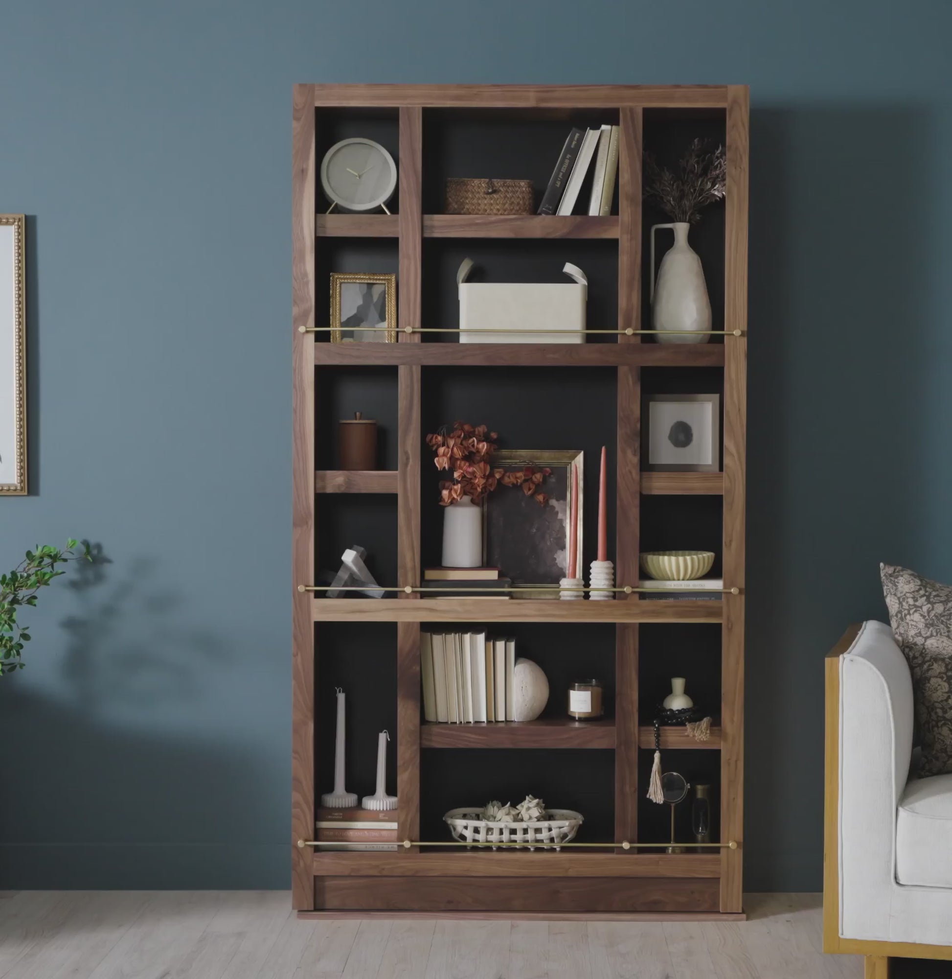Murphy Door® wooden bookshelf with rich walnut finish against blue-gray wall, displaying decorative items in stylish modern living room.